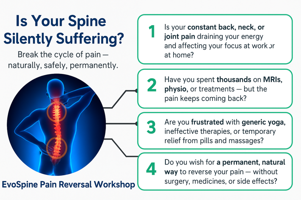👉 EvoSpine = 3-in-1 approach (Movement + Marma Therapy + Lifestyle Reset) → it heals the root cause, not just the pain.